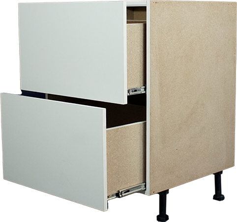 Floor Cupboard with 2 Pot Drawers that have a solid drawer bottom, 150mm Adjustable Plastic Legs